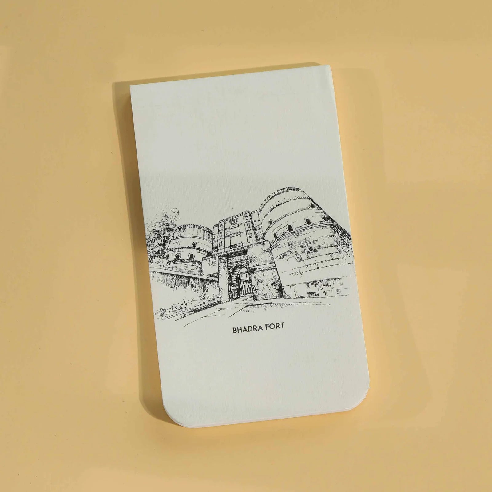 From writing down travel itineraries to documenting field notes, carry our Bhadra Fort Notepad in style to jot down your billion-dollar ideas. The brown and white cover with rounded corners features a hand-sketched illustration of the massive Bhadra Fort.