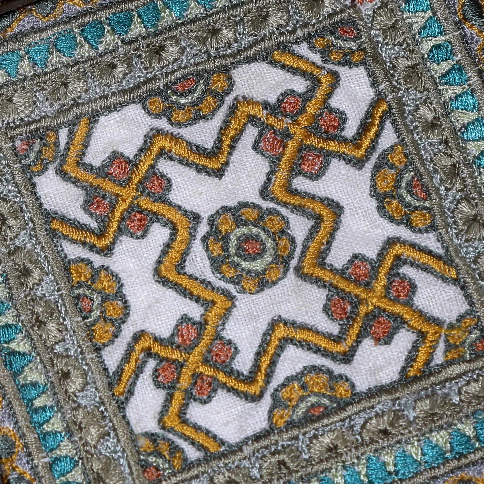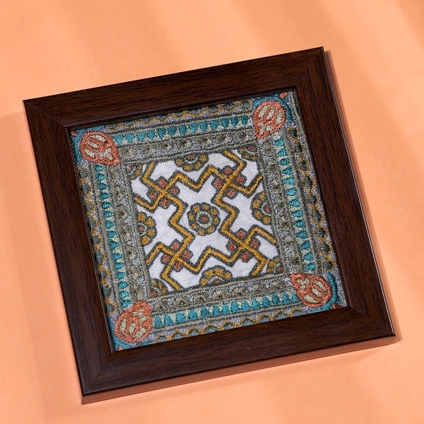 The Patan Patola Motif Coaster is inspired by one of the stone-carved motifs at Rani ki Vav. This beautiful embroidery design is on off-white cotton fabric with vibrant threadwork and a 0.5″ wooden frame.