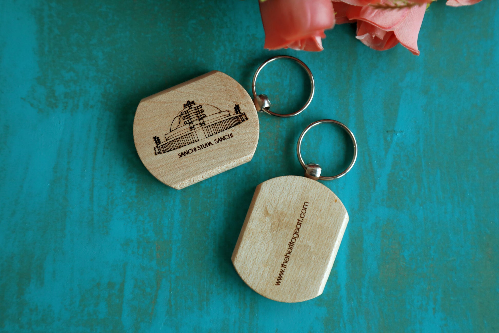 Lay your hands on an aesthetic Wooden Keychain of Sanchi Stupa – laser engraved on quality Pinewood. An affordable and handy Indian souvenir to be gifted to family and friends.