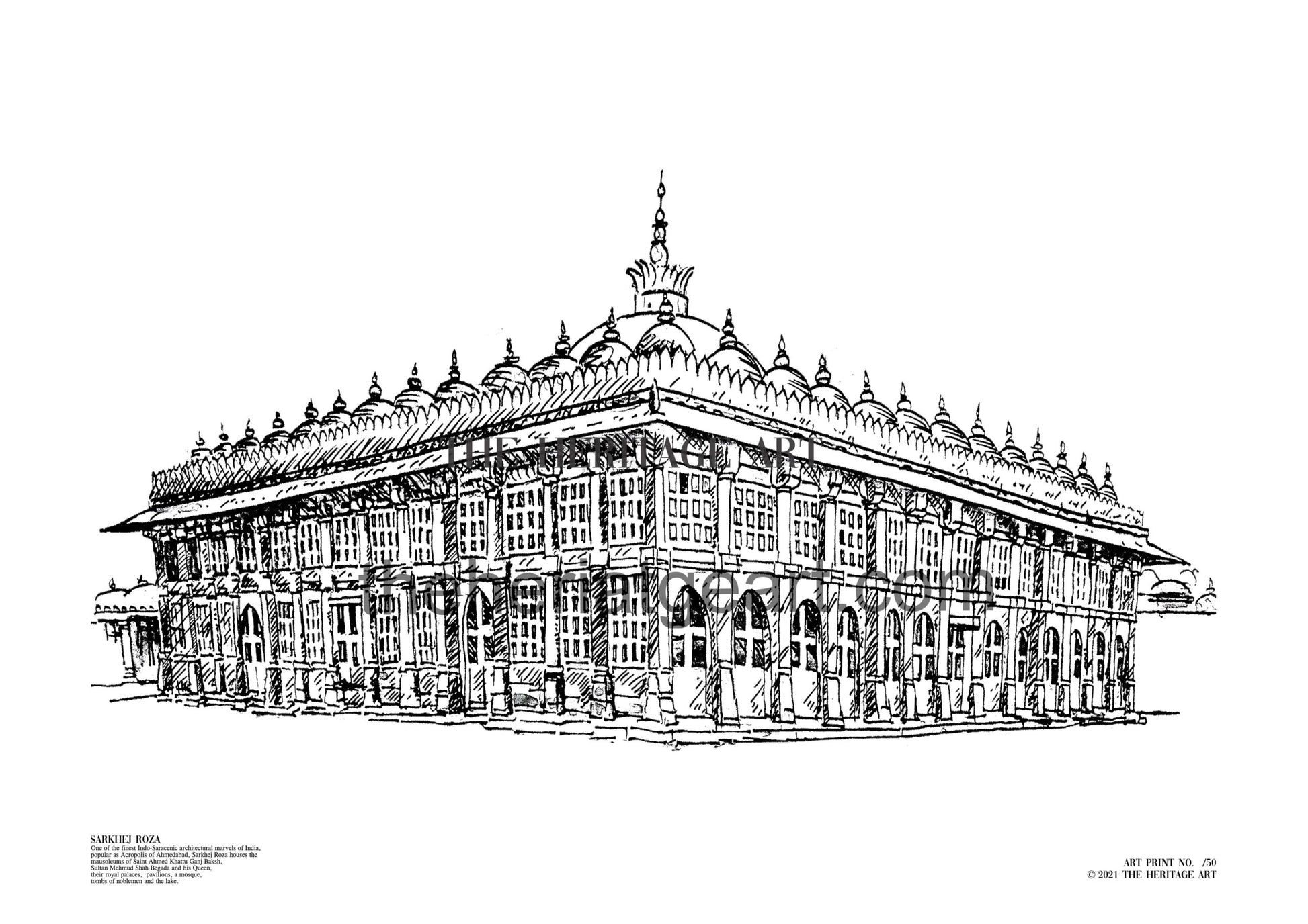 The hand-sketched illustration of the ancient necropolis of Sarkhej Roza is frozen in time. The artwork is a reflection of the architectural ambitions of the Gujarat Sultans. Grab a copy and welcome the spiritual energy of Sarkhej Roza to your home!