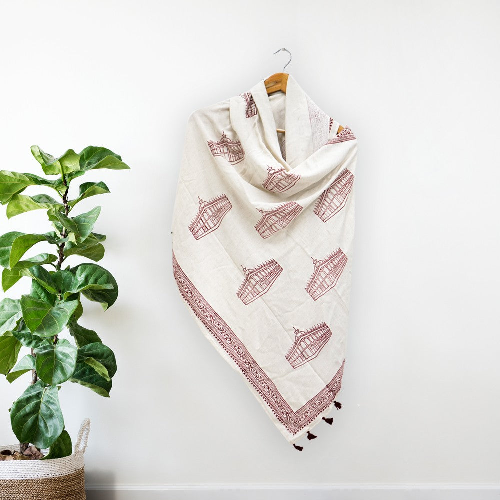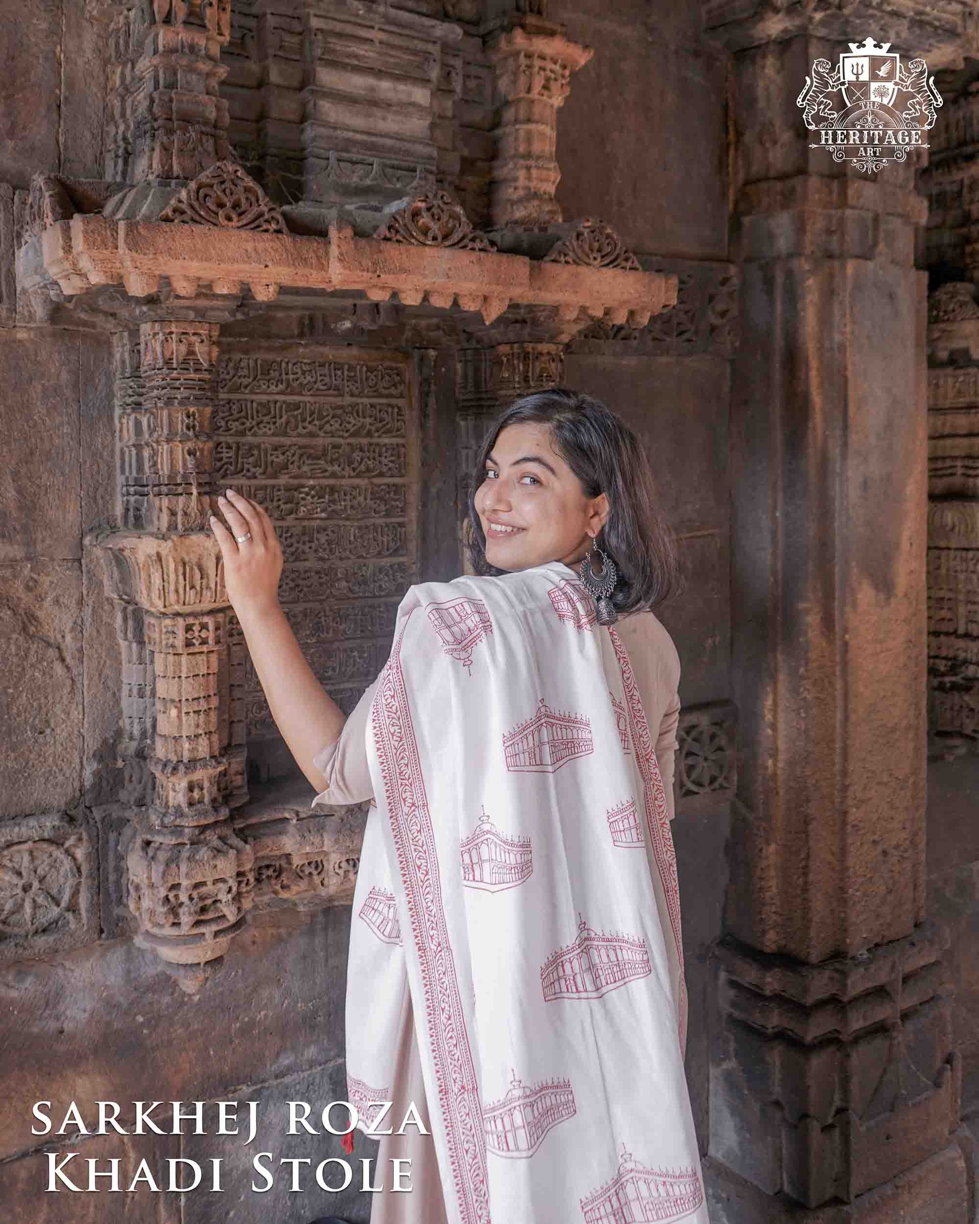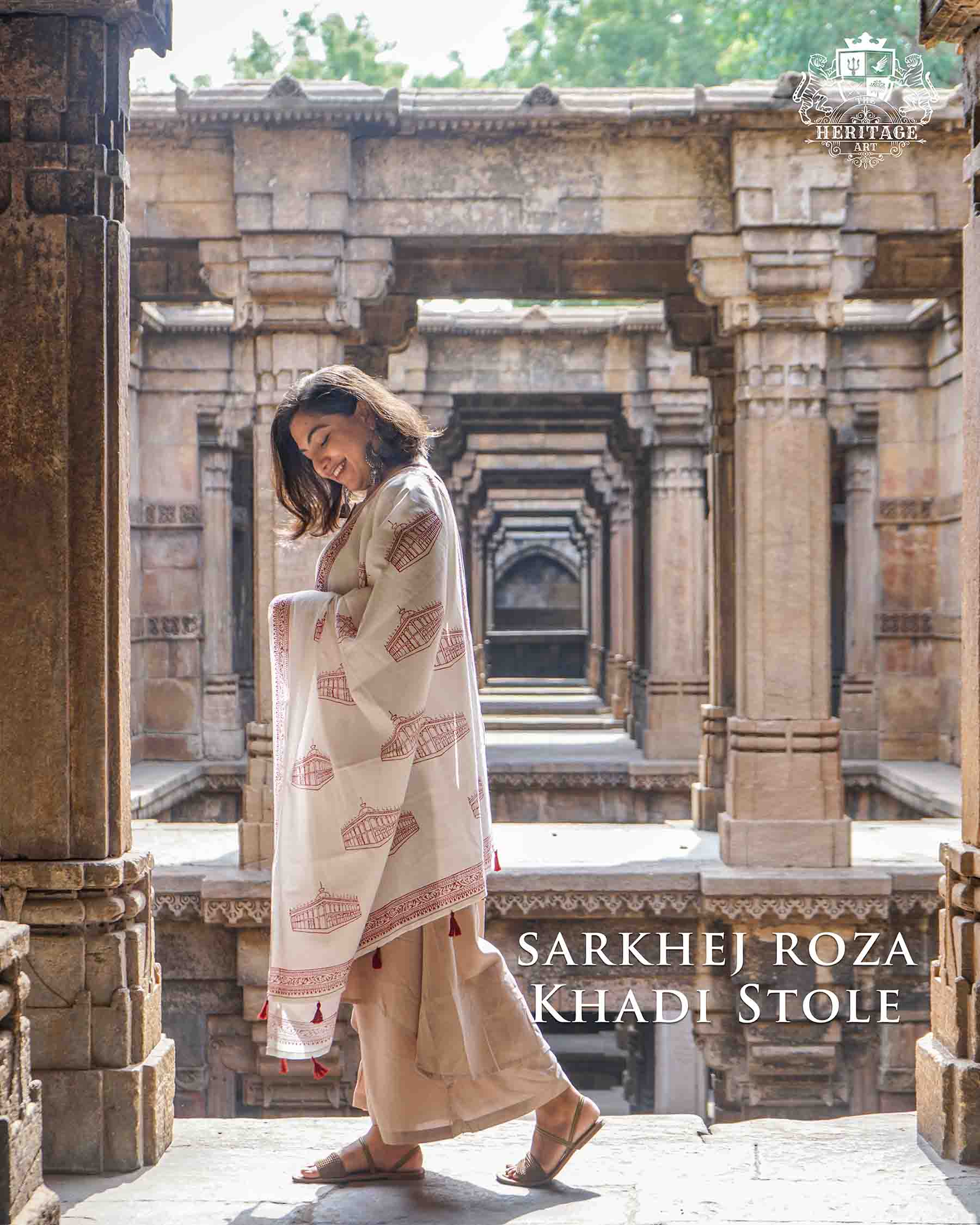 Colourful, hand-block printed and finely stitched, these multipurpose khadi stoles are adorned with motifs of Sarkhej Roza. Once a village practising the art of weaving and dying, Sarkhej Roza is known for its marvellous Indo-Saracenic architectural style and is a place for spirituality and serenity. This 120-pillared structure was coined 'Ahmedabad's Acropolis' by swiss French architect Le Corbusier.