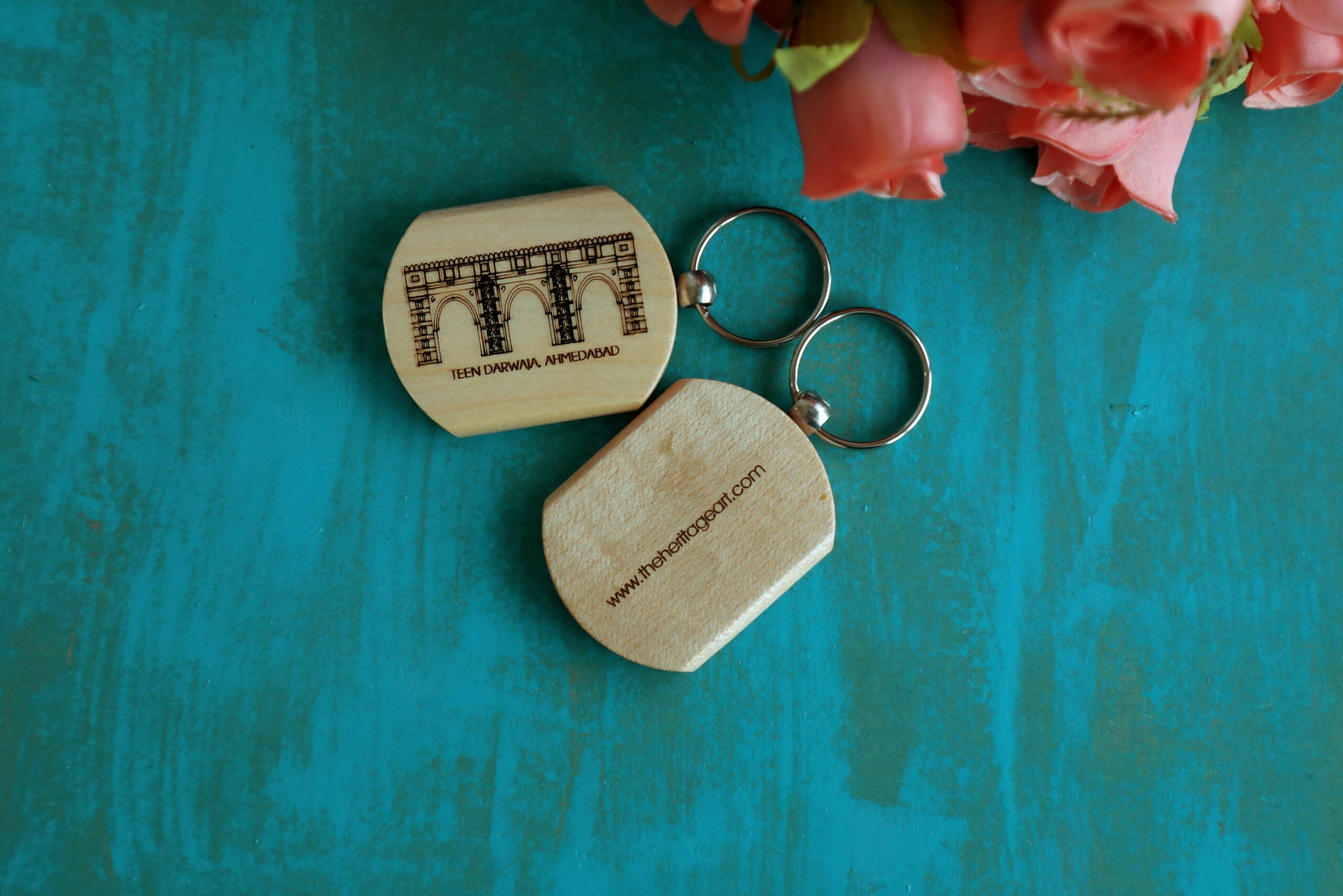 Lay your hands on an aesthetic Wooden Keychain of Teen Darwaja – laser engraved on quality Pinewood. An affordable and handy Indian souvenir to be gifted to family and friends.